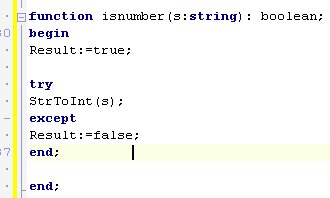 Проверять, число ли введено мы будем при помощи условия try .. except .. end; - это самый простой для понимания, но не самый лёгкий для устройства способ. Потом возможно покажу другой способ. Полегче для девайса, но тяжелее для восприятия.